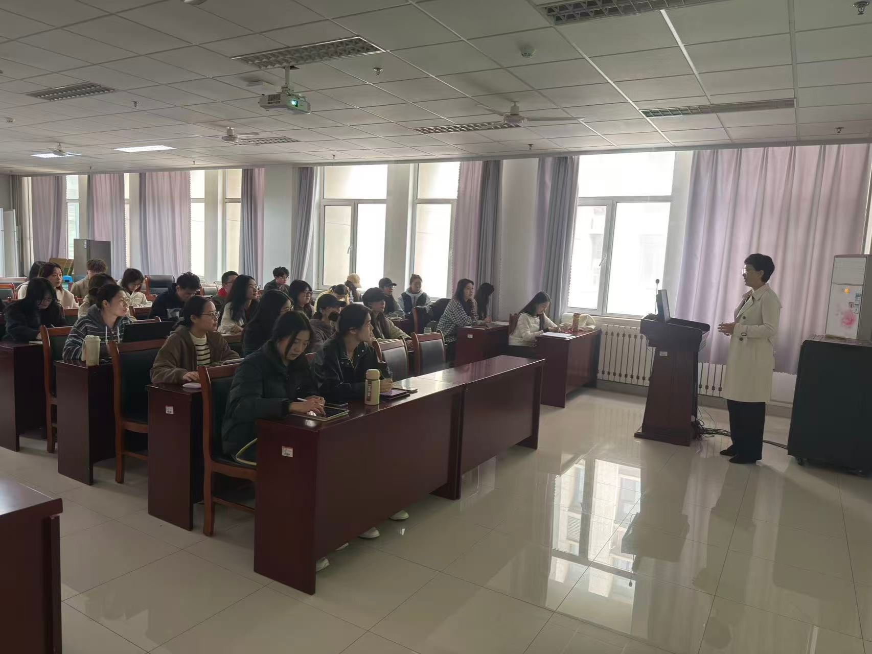 会上,车炳莹讲解了大赛的整体流程和赛事规则,重点分享了在校赛和初赛阶段的注意事项;郭迎澳分享了决赛前的准备工作要点,涵盖资料整理、课件准备和赛前模拟等多个方面;赵永鑫对决赛的具体流程进行了深入细致的讲解,并分享了赛后专家意见的反馈与总结;马清泽还进行了模拟试讲,展示了扎实的知识功底、清晰的表达逻辑以及生动有趣的授课方式。分享结束后,同学们就教学技能提升、大赛准备等方面的问题进行了现场互动答疑。