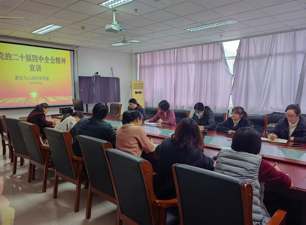 12月9日下午,教育系教工党支部开展主题党日活动,集中学习党的二十届四中全会精神,学院党委委员、副院长李开云为支部党员解读了党的二十届四中全会公报。宣讲会由党支部书记冯建民主持。