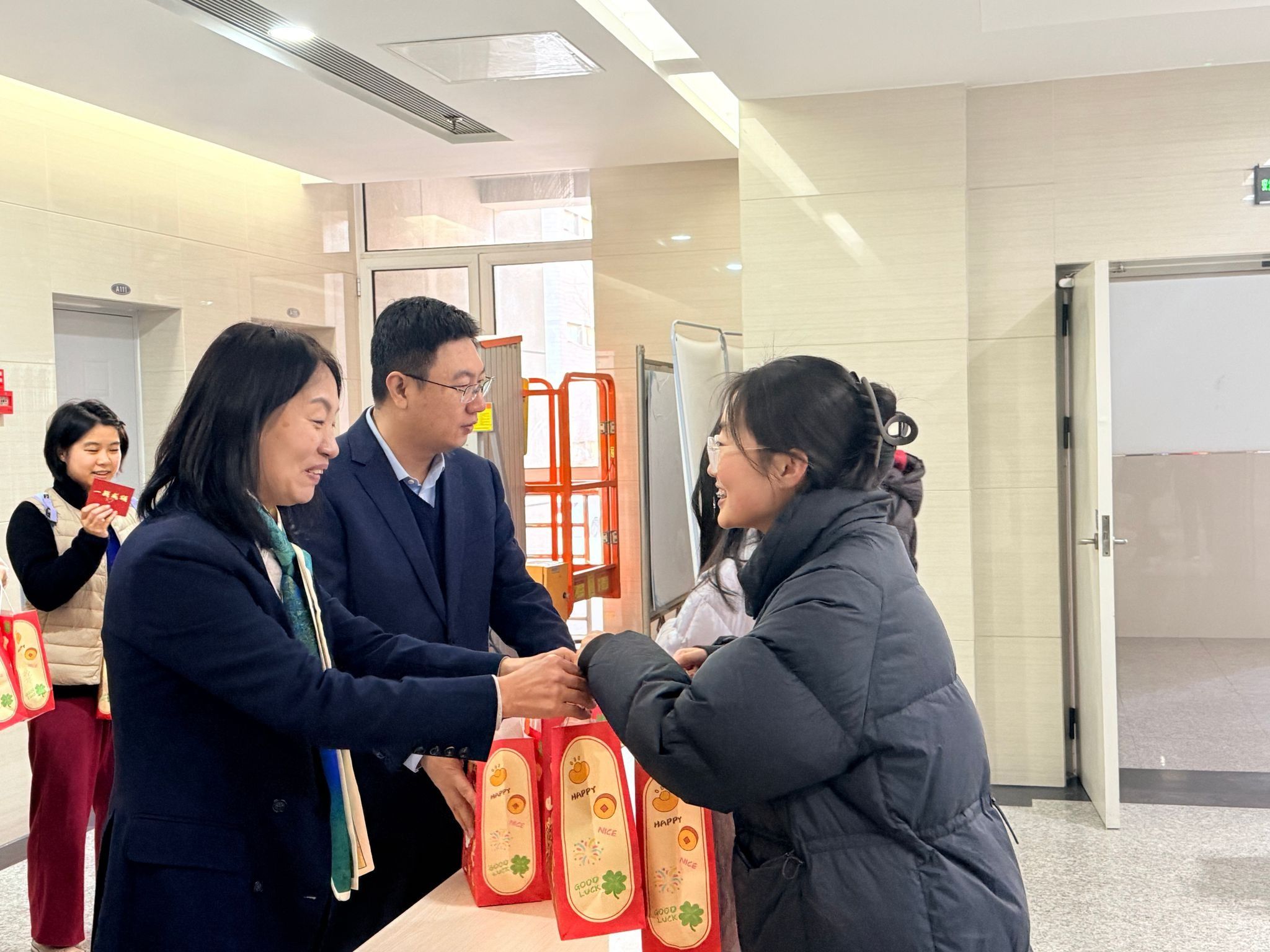 学院为每一位2026届考研学子精心准备了“考研加油礼包”。礼包内含寓意美好的各式礼品:印有“一战成硕”的祝福卡片、象征“心想事‘橙’”的橙子、寓意“旺气加持”的旺仔牛奶、代表“巧克难题”的德芙巧克力以及期盼“乐事将至”的乐事薯片。这份充满心意与巧思的礼包,让紧张备考的学子们深切感受到了学院的温暖与关怀。